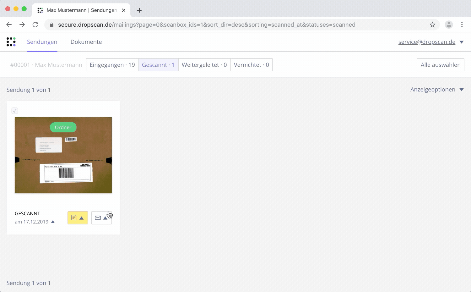 - Sie können den Aktenordner nun in Ihrem Dropscan-Konto zum vollständigen Scannen anfordern. Entweder scannen wir dann den Aktenordner für Sie in ein digitales Dokument oder erstellen auf Wunsch auch mehrere Dokumente.