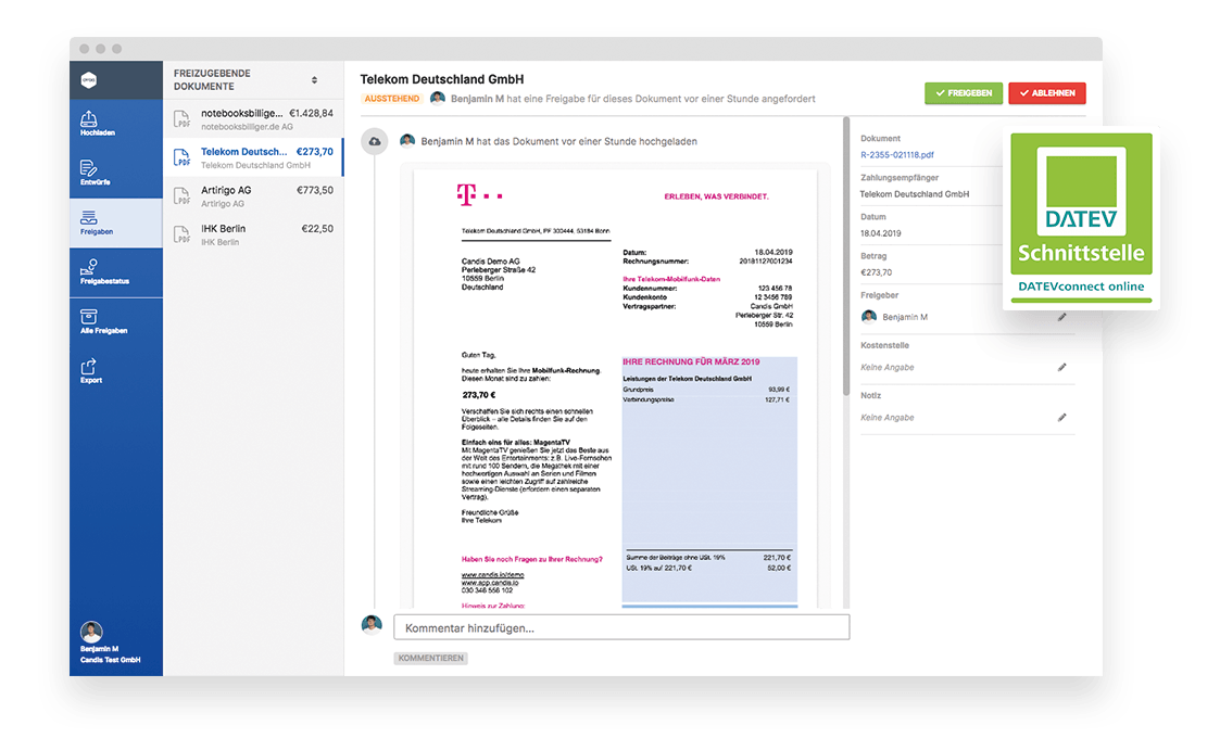 CANDIS bietet Ihnen die passende Lösung für Ihre Buchhaltung und Rechnungsfreigabe. CANDIS importiert die von Dropscan gescannten Dokumente, wie Belege und Rechnungen und erkennt mittels intelligenter Datenextraktion zu 99% alle relevanten Daten. Dadurch können Ihre Belege und Rechnungen sortiert und den erforderlichen Rechnungsperioden zugewiesen werden.