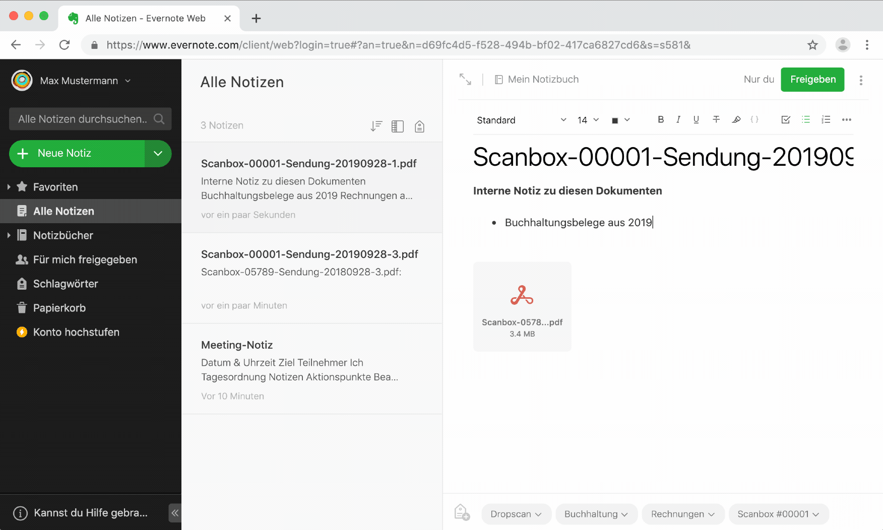 Sofort nach Anfertigung der Scans werden Ihre PDF-Dokumente automatisch in ein Evernote Notizbuch Ihrer Wahl hochgeladen.